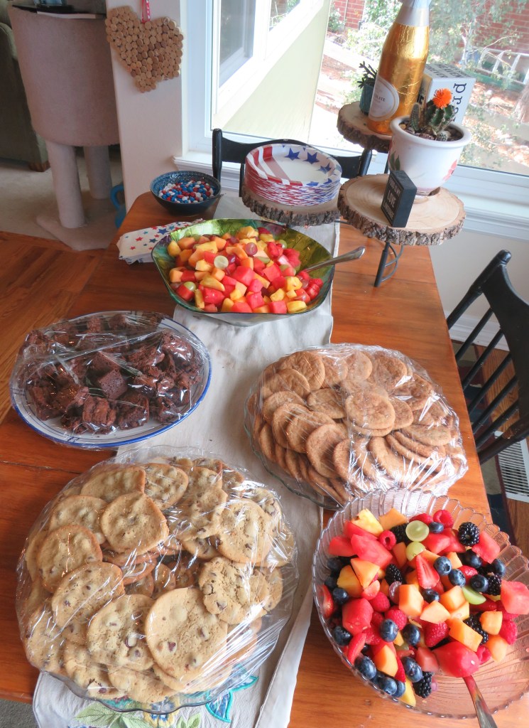 Larry smoked all the meat and I did all the rest. We had brisket, pulled pork, chicken and brats for the meat. I added potato salad, fruit salad, 2 kinds of cookies, brownies, chips, pico de gallo, guacamole, corn cobettes, and a Caribbean coleslaw. We had just a little bit of a feast. Everyone was in awe, and more than one of the guests asked if I had a background in the restaurant industry. UMMMM, yes, actually I do. Many, many years too. πŸ™‚