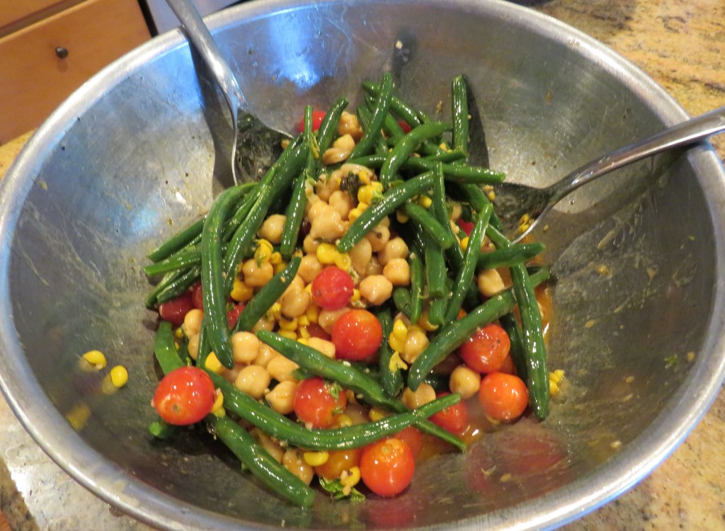 As always, I was inspired by their recipe, but of course, I tweaked it a bit to make it my own. It is a bright, beautiful, healthy and delicious salad that is good anytime. I served it with the rest of the pork that Larry smoked for Bryan’s party, as well as some pan-fried potatoes and toasted ciabatta and a Spanish white wine on the side. Caribbean Cole Slaw It was a perfect end of summer meal. I also added some of the corn leftover from that same party into the salad too. We have finally used all of the leftovers from that party as well. I also used most of the little Sweet 100’s tomatoes from Janet and Bob’s garden, though I still have a bunch more tomatoes to use.