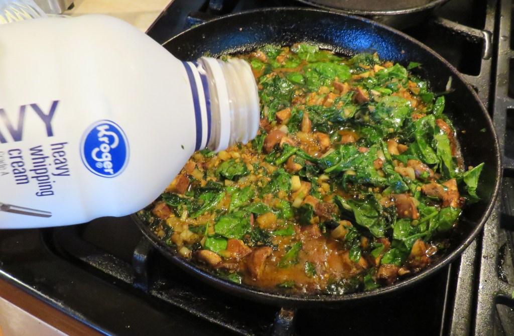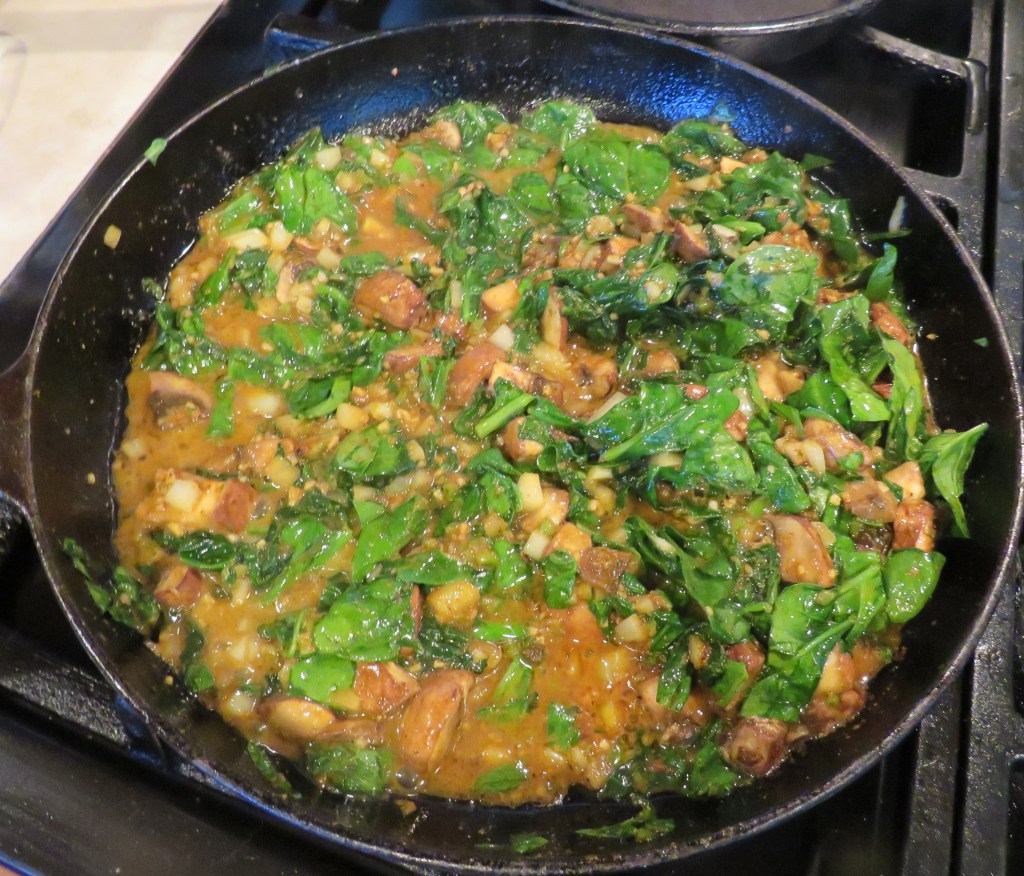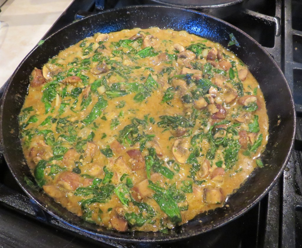 When the spinach and mushrooms are cooked, add the garam masala and cream and incorporate well into the mixture and continue to cook for about 1-2 minutes, stirring constantly. Adjust the seasonings as needed.