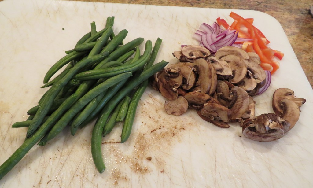 I served my pork over wild rice and then topped it with vegetables as well. For my vegetables, I used some green beans, red pepper matchsticks, red onion slices and mushrooms.
