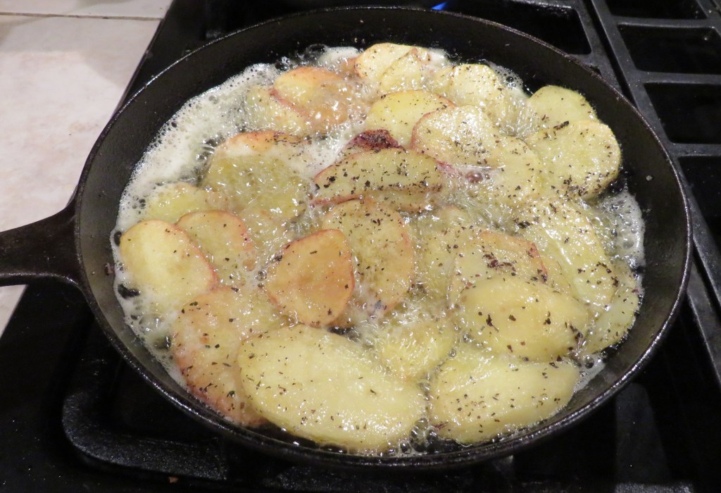 Then I got the skillet very hot and added the butter and the oils. I arranged the potatoes in the pan, gave a good sprinkling of coarse salt and let them cook for about 7 minutes, or until they browned, before carefully turning them over to cook the other side.