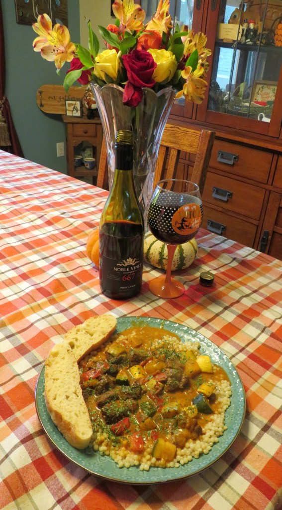 I served it over couscous this time, but you can serve it over couscous, rice or pasta. Each one will add a slightly different personality to the dish. Because it is lamb, and has big, bold flavors, I served it with a pinot noir on the side, that complimented the meal nicely.