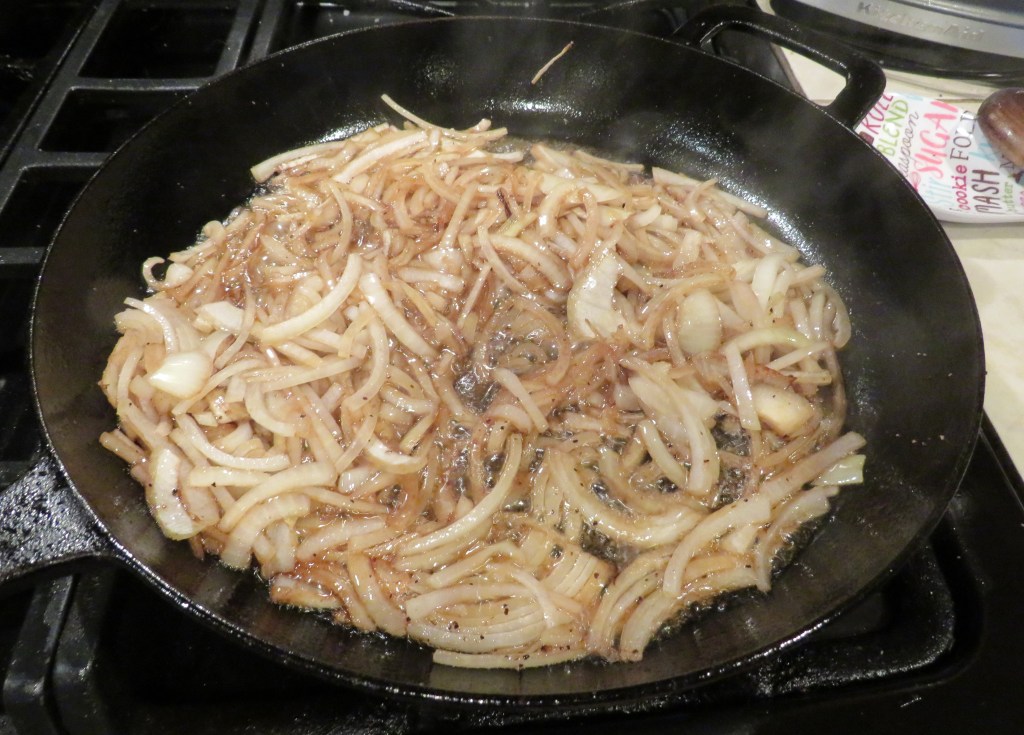 When the onions are caramelized, add the mushrooms and cook for an additional 2-3 minutes, then add the beef broth, Worcestershire sauce and herbs. Adjust the seasoning as needed.