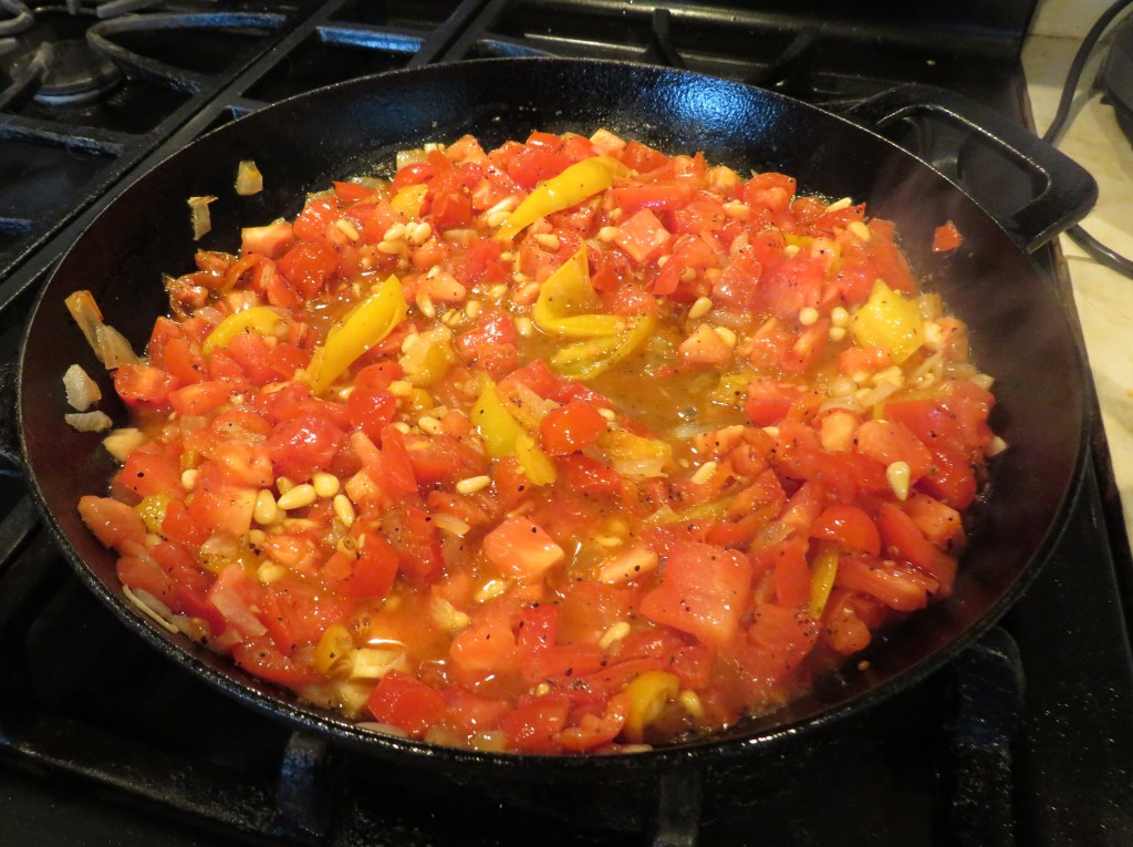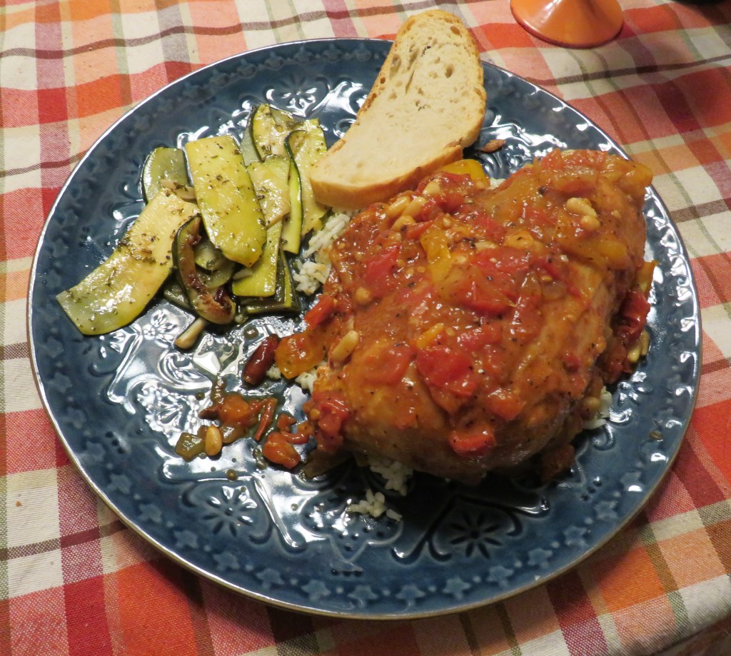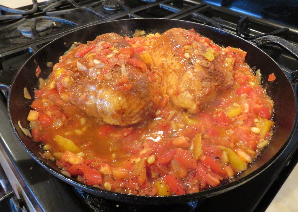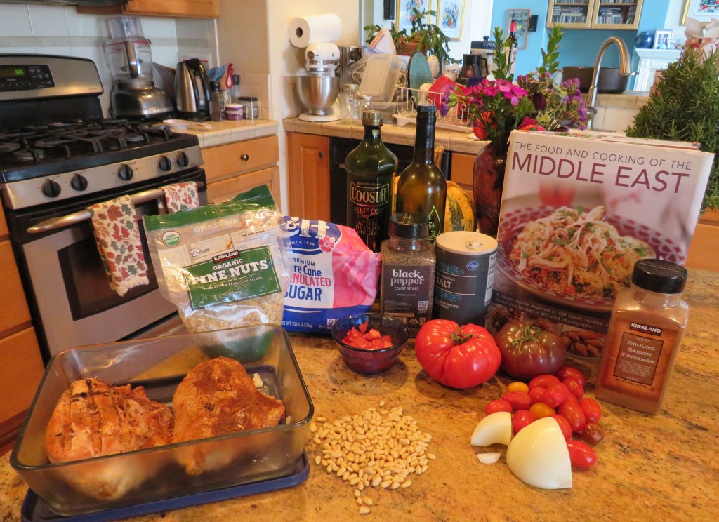 We are still working our way through the chicken Larry smoked on the smoker. Larry said he wanted it made into something Middle Eastern to go with the Middle Eastern meze that our neighbors Hanaa and Aziz brought over to us. No problem. I made a Middle Eastern tomato sauce to go with the chicken.