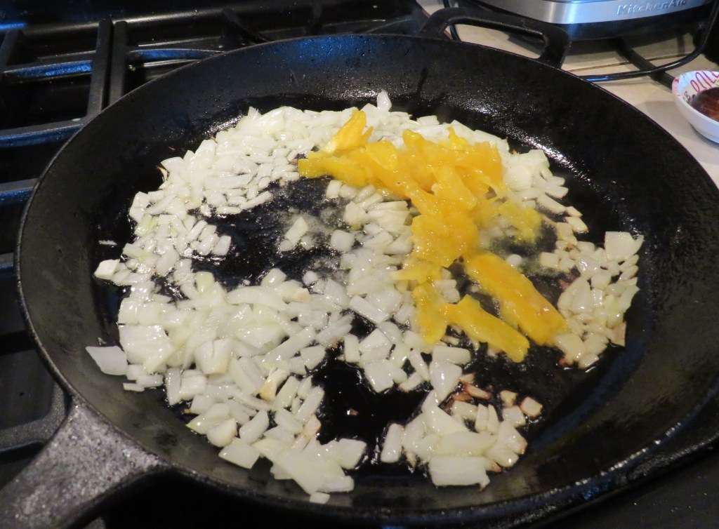 Get a large skillet very hot and add the oil(s). If cooking your chicken, brown it completely then remove and set aside to keep warm. Add the onions and peppers, and cook for about 3-5 minutes, or until they soften and the onions are translucent.