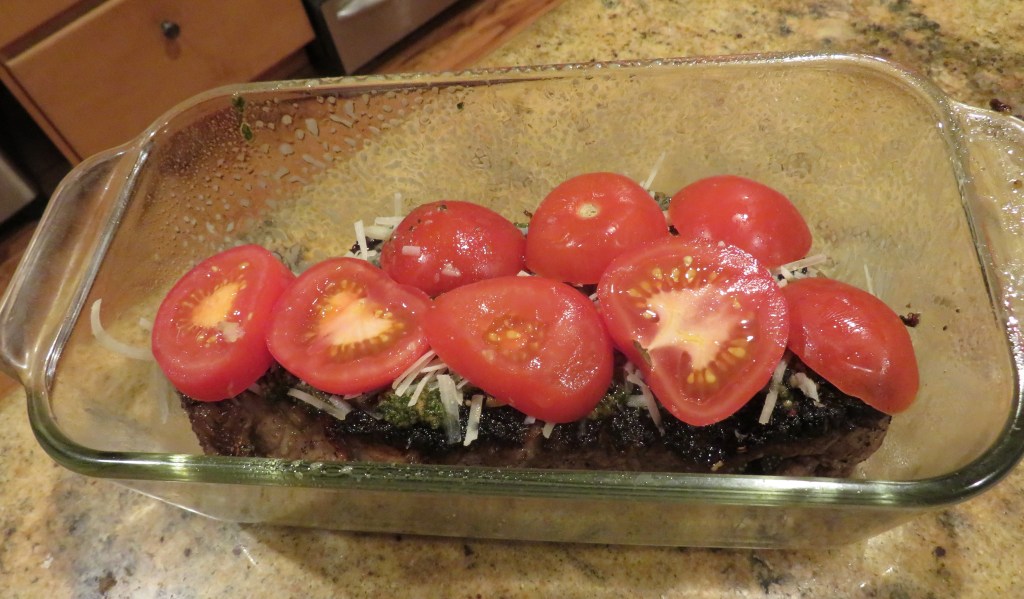 I had some pesto, Compari tomatoes and shredded Parmigiano cheese, so I combined them all together to make steak Italian style.
