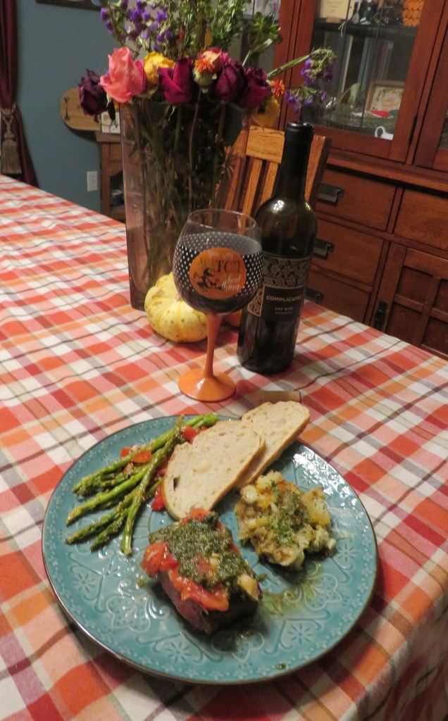 Once it was done, I added another dabble of pesto on top then served alongside some leftover scalloped potatoes and asparagus, with a delicious, full bodied red blend to complete the meal. The steak was nice and rare/medium rare on the inside, browned on the outside, tender and juicy and full of flavor. What more can you ask for in a good steak, right? It was perfecto!