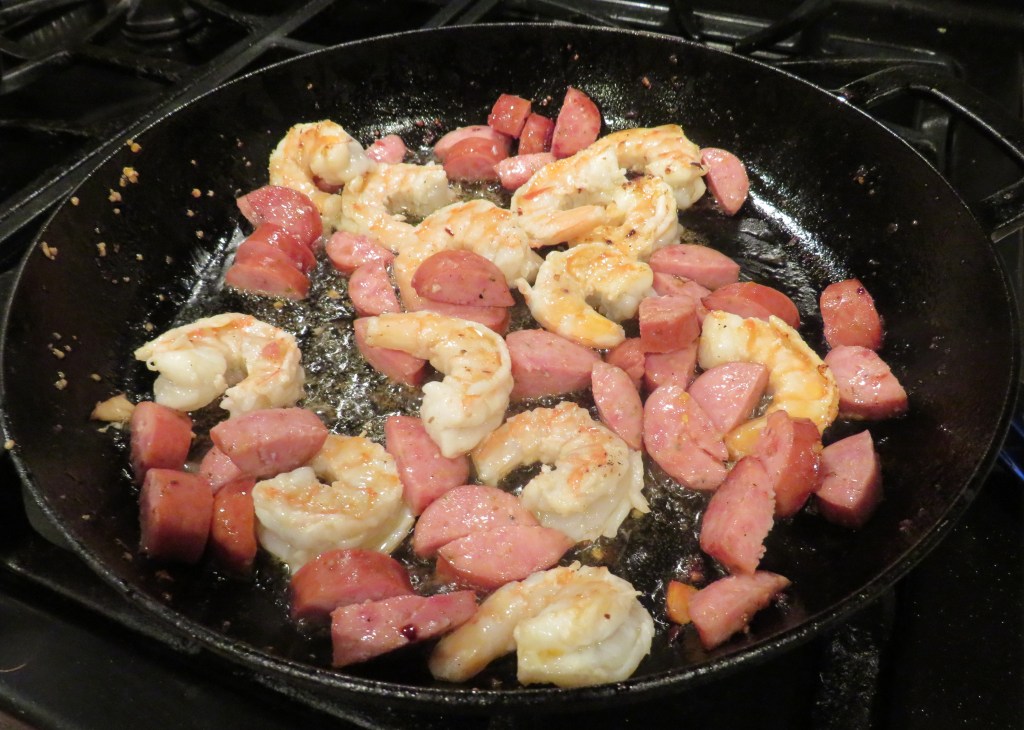 Remove the vegetables and set aside to keep warm. Add more oil(s) if necessary, and add the shrimp and sausage. Cook for about 3-4 minutes, or until the shrimp and sausage are cooked.