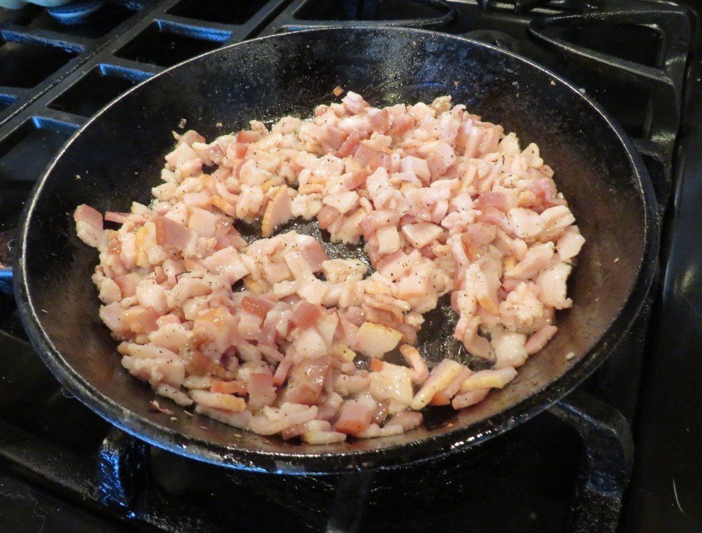 Cook the vegetables in olive oil and/or butter for about 5 minutes, or until al dente. If you want to prepare both vegetarian and non vegetarian options, cook the bacon and vegetables separately. Cook the bacon fully and drain off the excess grease then mix in with the cooked vegetables, after you have made your vegetarian versions. If you are only making the meat option, you can cook everything together.