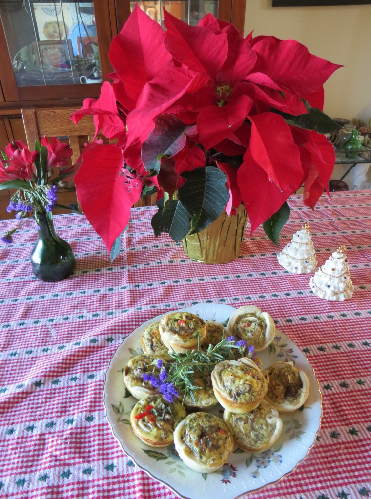 One of the menu items I served at our annual Christmas party, Post Party was mini quiches. I made quite a few, both vegetarian and bacon versions. I made a lot because I knew I was going to have a house full of hungry people. Sometimes, I make mini, mini quiches, but this time I opted for a medi-mini size. I made them in my regular muffin pans.