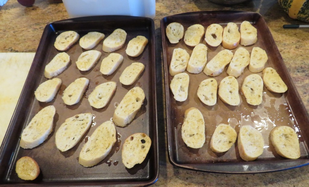 I coated my baguette rounds with olive oil on both sides and baked them at 400*F or 200*C for about 25-30 minutes, flipping them over at about the half way point to get them golden brown and crispy. I used regular olive oil and a hint of red chili oil too.
