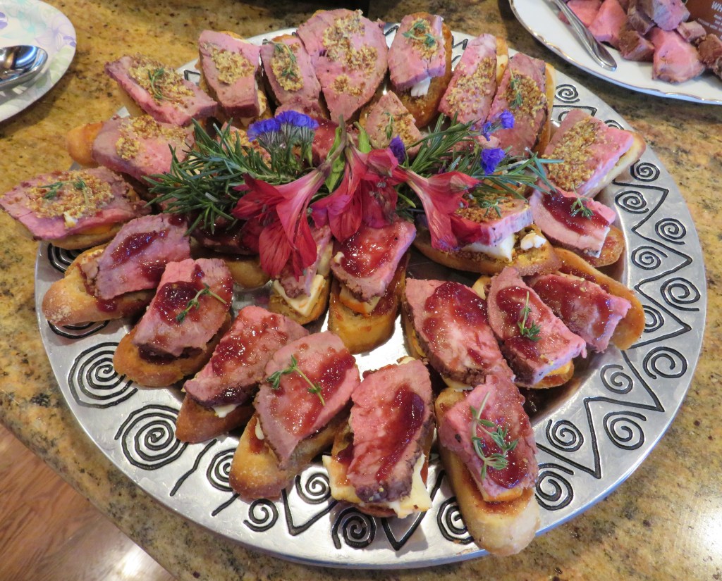 I sliced the beef into thin slices. I put a small spread of either sour cherry spread or whole grain mustard on the crostini, added a little Port Salut soft cheese, topped them with the beef and then an additional spread of sauce on top. Then I added a tiny sprig of fresh thyme for decoration.