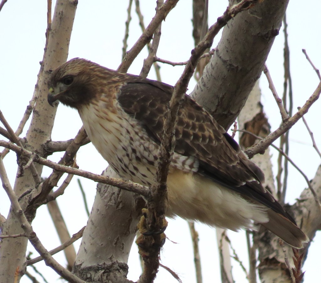 When we were picking up Mike & Lauren before heading to lunch at Perdida, Perdida, as I was getting out of the car, I noticed a beautiful Redtail Hawk in the tree behind their garage. He was just watching and waiting for his opportunity to strike. He looked so beautiful and regal perched in the tree.