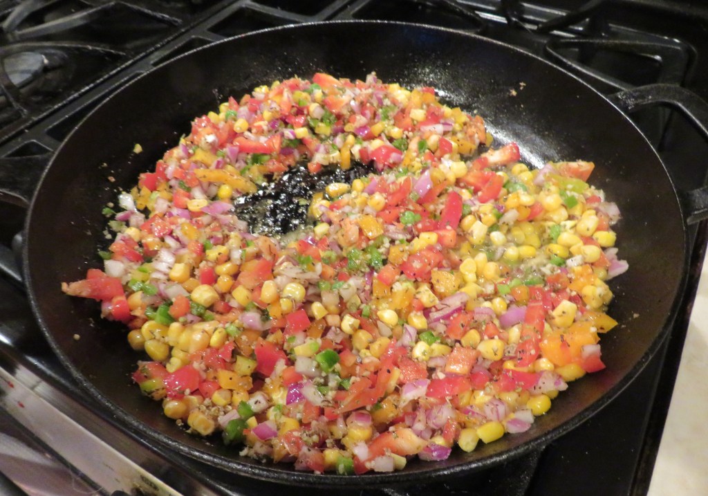 You can use any kind of vegetables you like, but I kept it simple, with Mexican style vegetables. I used red and orange bell peppers, garlic, red onions, jalapenos, and corn as my vegetable filling. I sauteed them until they were softened and tender, then added some leftover shredded chicken (already cooked). I added some cumin, oregano, thyme and salt & pepper to the mix.