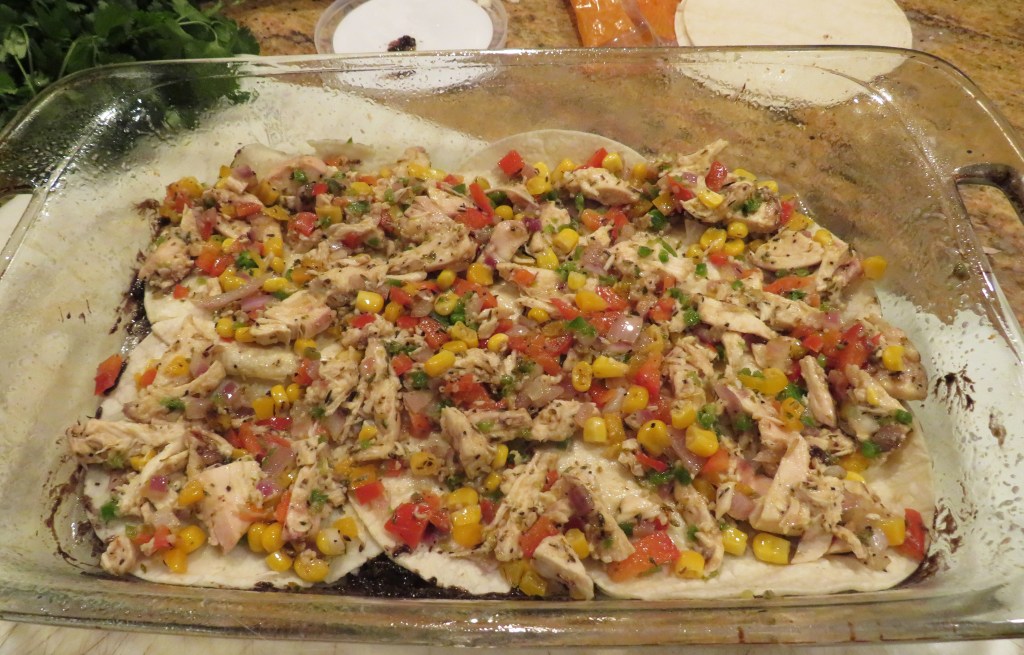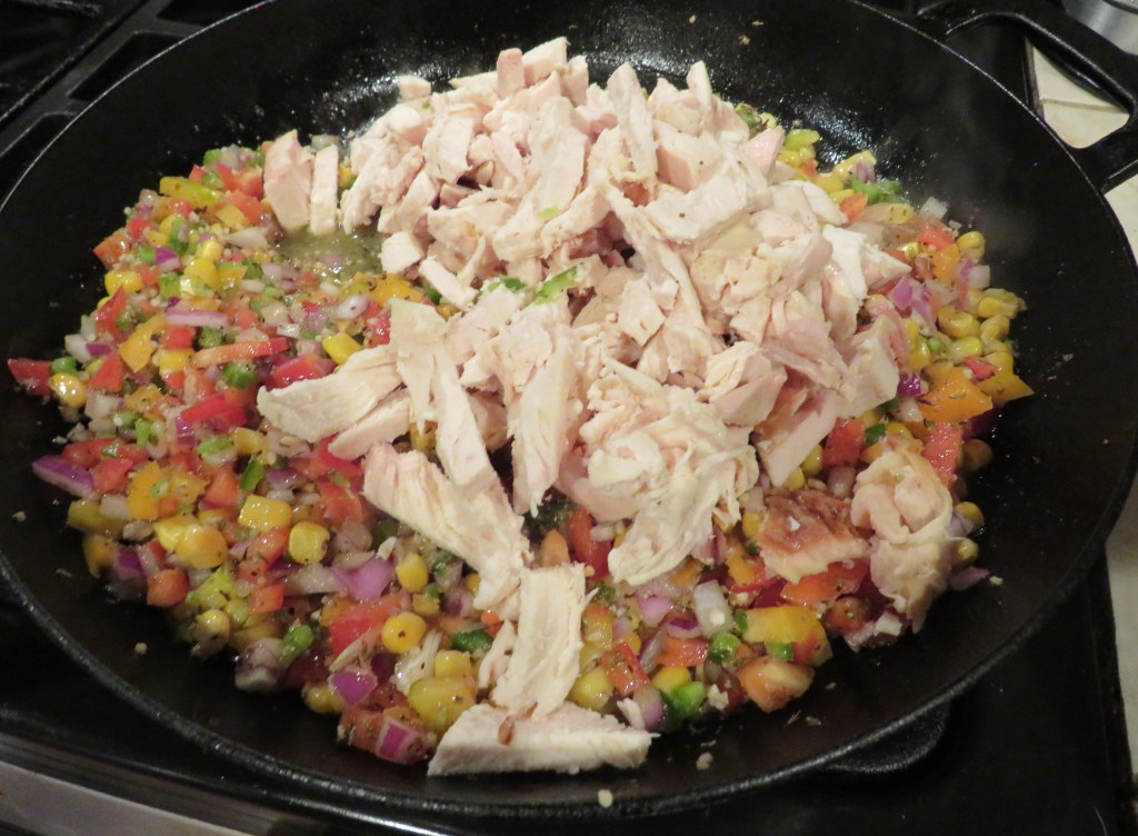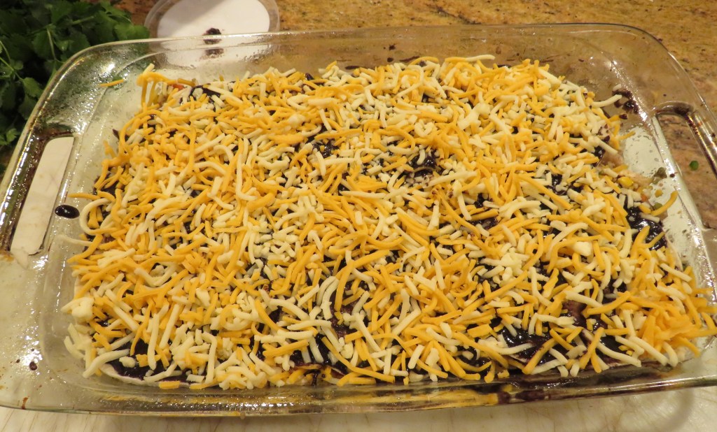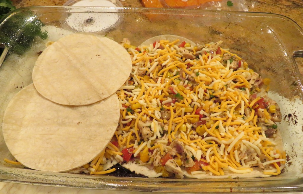Next came a layer of the vegetables and chicken mixture, topped with shredded cheese. I used a Mexican blend.