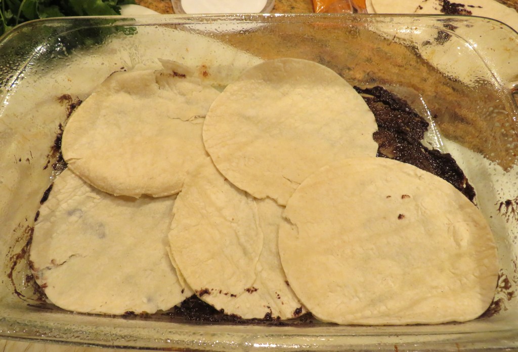 When the chicken and vegetables were ready, it was time to start the layering process. I heated the mole sauce and lightly spread some on the bottom of the prepared baking dish. Then I heated up the tortillas (I just put them in the microwave for about 30 seconds) and placed them on top of the mole.