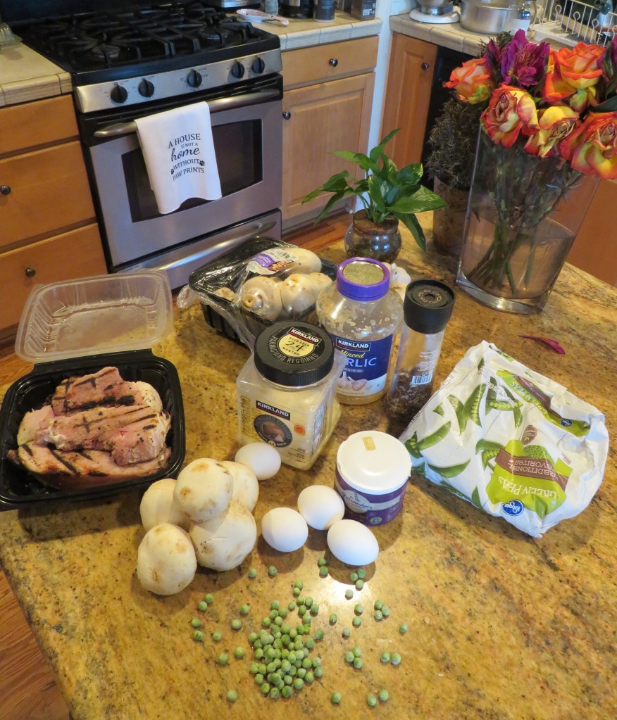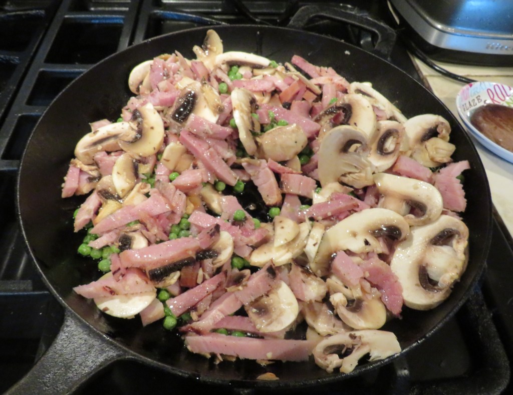 Get a large skillet very hot, then add some olive oil and add the ham, peas, mushrooms and garlic. Cook for about 5-7 minutes, or until everything is hot and the meat is cooked.