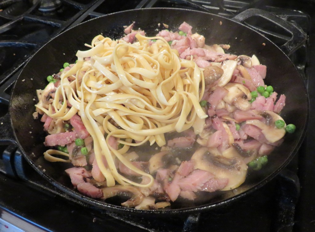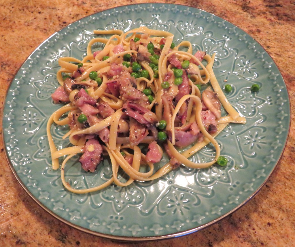 Any type of pasta can be used for this simple dish, but most often it is spaghetti, linguini or fettuccine. It is a simple, poor man’s dish made from pasta tossed with a creamy sauce of raw beaten eggs, accentuated with crisp bits ofย guanciale, and finished with a shower of grated agedย Pecorino Romano cheeseย plus freshly ground black pepper. I added ham instead of the guanciale, Italian bacon, and added peas and mushrooms as well. What can I say, I like stuff in my stuff. ๐