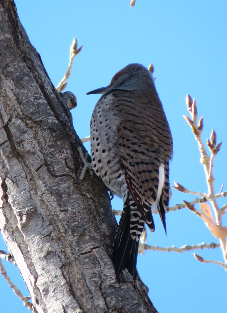 Before seeing my beautiful big Blue Heron, Nature Walks – A Winter Heron, I saw a few Northern Flickers working the trees. Some were pecking away at the tree trunks, while others were just posing for the camera, and others were playing hide and seek in the leaves. I never tire of seeing them, no matter what they are up to.