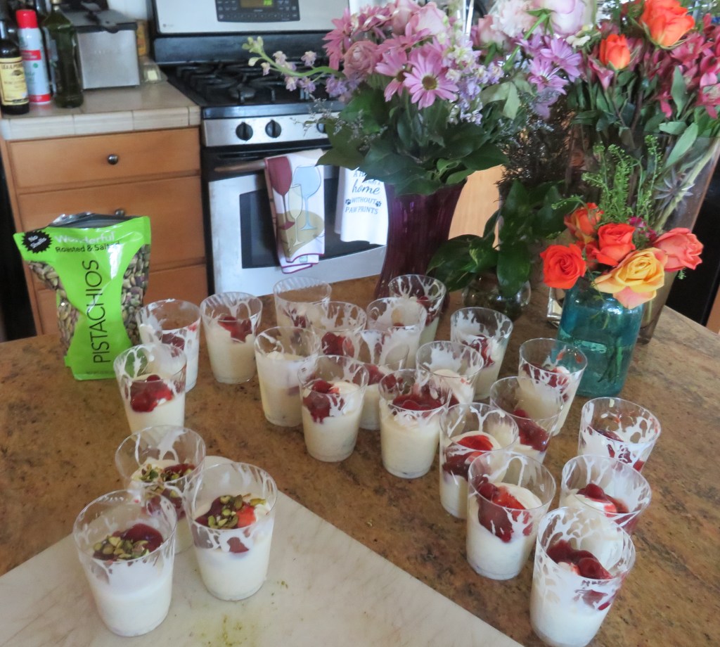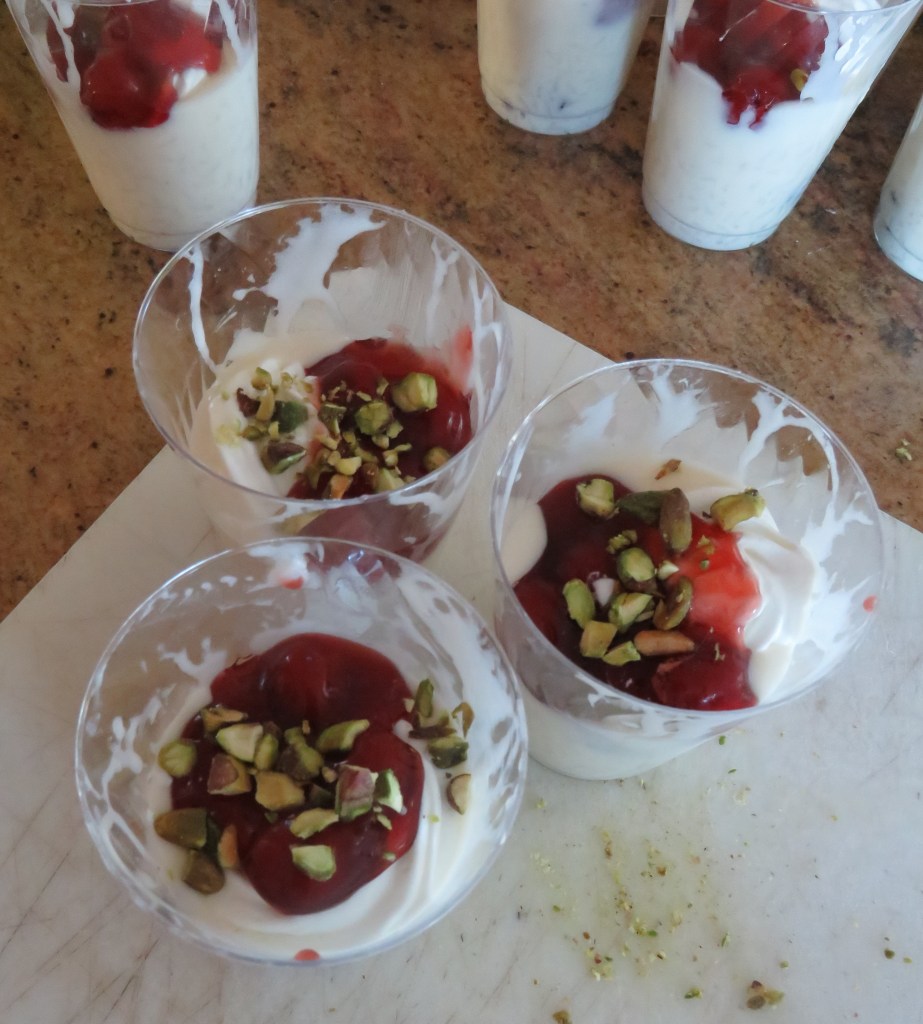 We are going to have a houseful of 23 people, so I portioned it into individual cups and added more whipped cream on top. It still needed some more pizzazz, so I added some cherry pie filling and then topped them off with chopped pistachios.