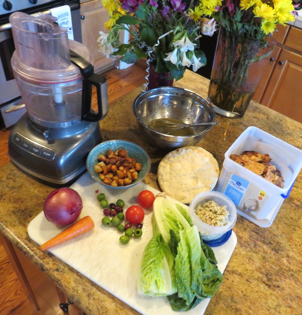 I served our fattoush with warmed pita bread and hummus (lemon hummus this time) with a chilled, cool, crisp chardonnay on the side. It was a perfect spring or summer time meal. If you don’t want chicken, it is perfectly fine just the way it is, or with some tofu as a protein option.