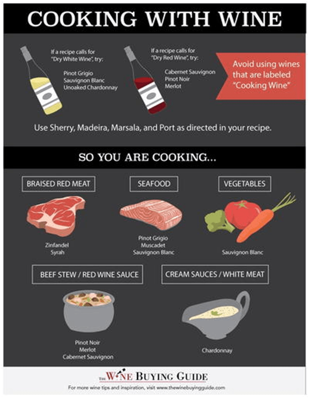 The possibilities of cooking with wine are endless.  But don’t cook with cheap wines.  If you are going to serve wine with the meal, use the same wines to cook with that you would serve with the meal.  Another rule of thumb is to use the same guidelines when cooking with wines as you would for pairing wines and foods together for serving.  As a general rule, red wines are for heartier red meats and lamb or for red sauces, such as a marinara sauce.  White wines are used for lighter foods, chicken, fish and lighter sauces, such as a béarnaise sauce.  Pork is one of those grey areas though, that either a red wine or a white wine will work well, but it depends more on the type of sauce you are using for the pork.  You want to pair food and wine of similar weight and texture when cooking with wines.  This helps balance out the recipe.  If using wine for baking, generally a sweeter wine, such as a sweet Riesling or Gewürztraminer or a Moscato should be your wine of choice.  Brandy and ports are also good choices for cooking purposes too, both sweet and savory.  They too, will give a little sweetness and add a rich quality to the foods.