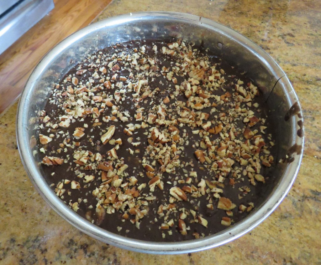 Mix the liquids into the dry ingredients and mix thoroughly. Fold in about 1/2 the chopped nuts, and just mix until all blended together. DO NOT over mix. Pour the batter evenly into the prepared cake pan.