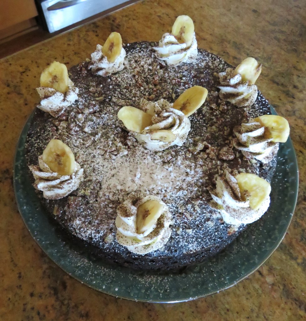 Let the cake cool completely before removing from the pan and dusting the top with powdered sugar. I also added some whipped cream, topped with a sprinkling of cocoa sugar, and banana chips.