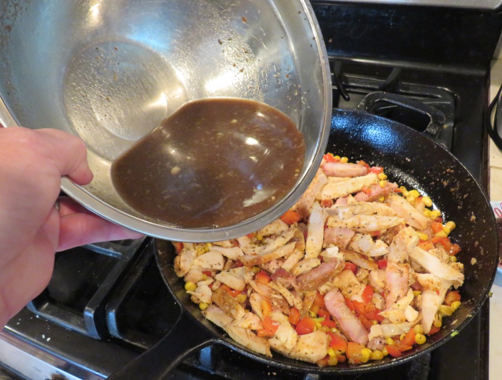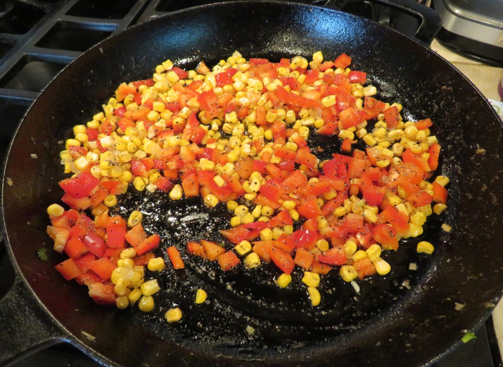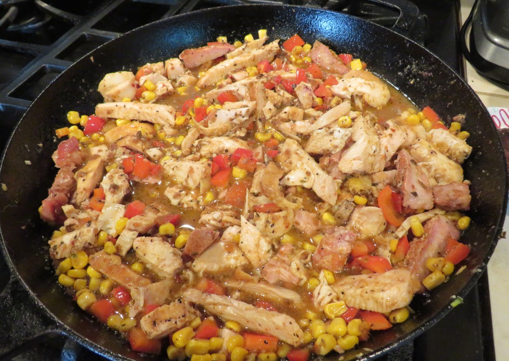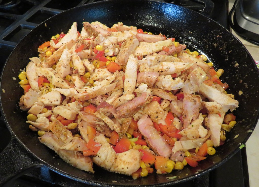 I cut the chicken and pork into thin strips. I sauteed some corn and red bell peppers with olive oil, salt & pepper to soften them up and added my cooked chicken and pork.