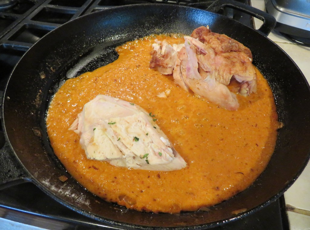 When the sauce is smooth, pour it back into the skillet. If you are cooking the chicken, add it to the sauce. Bring to a boil, then reduce the heat to a simmer and continue to cook for about 45 minutes, or until the chicken is cooked completely, stirring occasionally. I used cooked chicken breasts , so I only cooked it long enough for the chicken to heat up thoroughly.