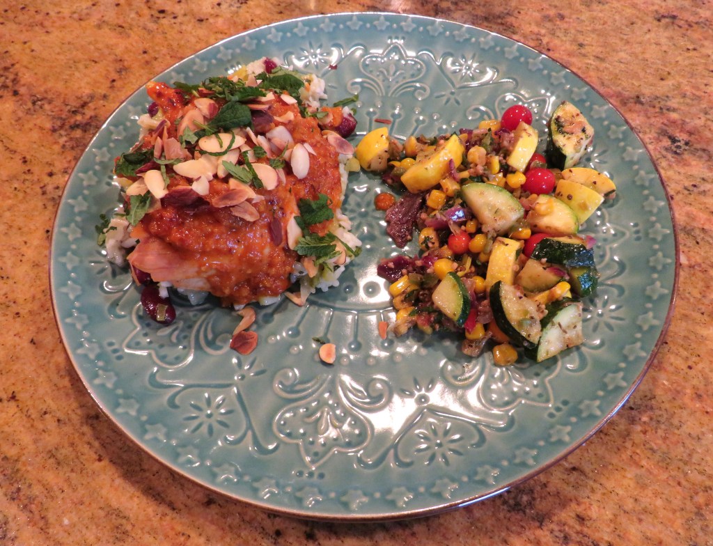 Serve over rice and with your favorite Mexican side dishes and Disfruitar! I topped it with more toasted almonds and chopped cilantro and lemon verbena from my backyard.