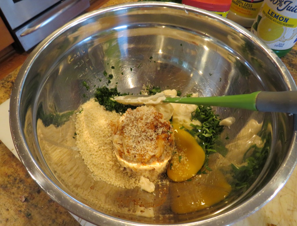 This dish is a layered dish. First I made the crab cakes, Maryland style, with very little breading.