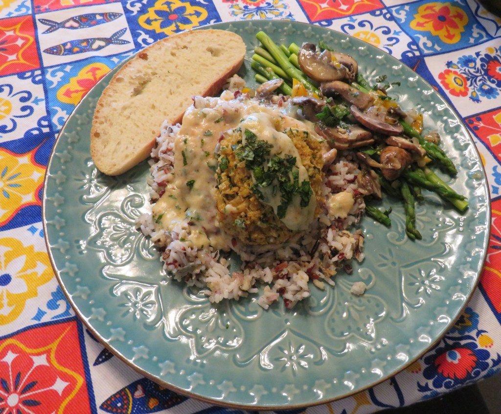 Once everything was hot, I dished up and served it over wild rice. First, a layer of rice, then a little sauce, next came the chicken, followed by the crab cake, finished with a dash more sauce on top. A cool, crisp chardonnay was the finishing touch that made the meal perfect, along with some asparagus topped with mushrooms, garlic, shallots and peppers.