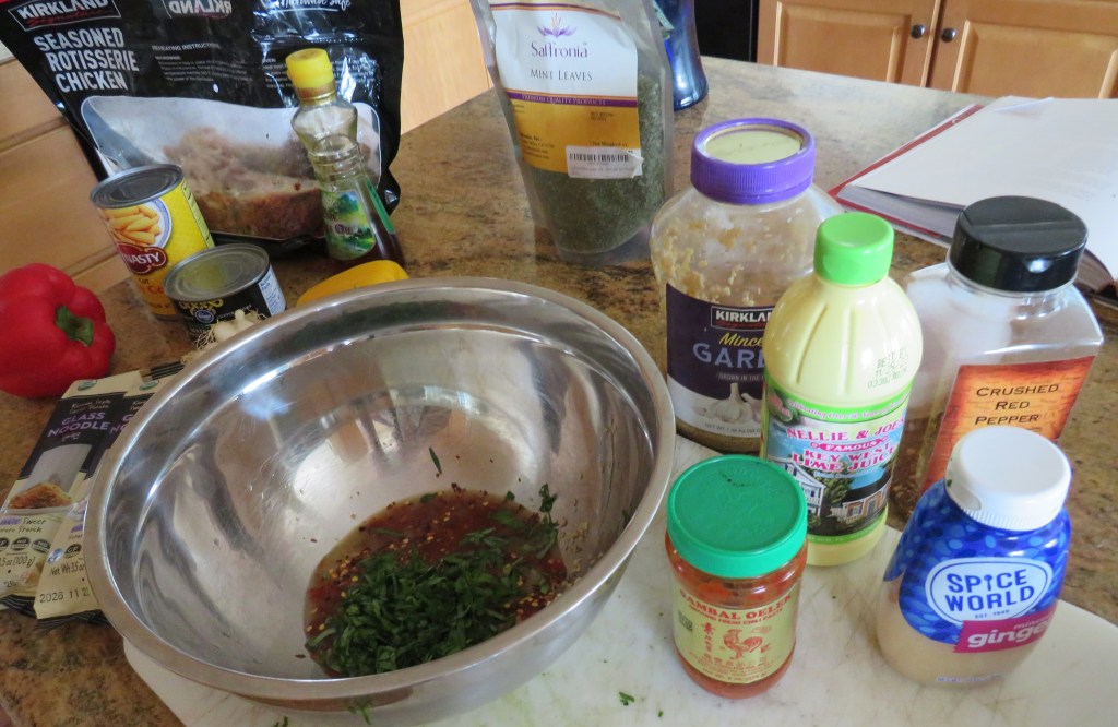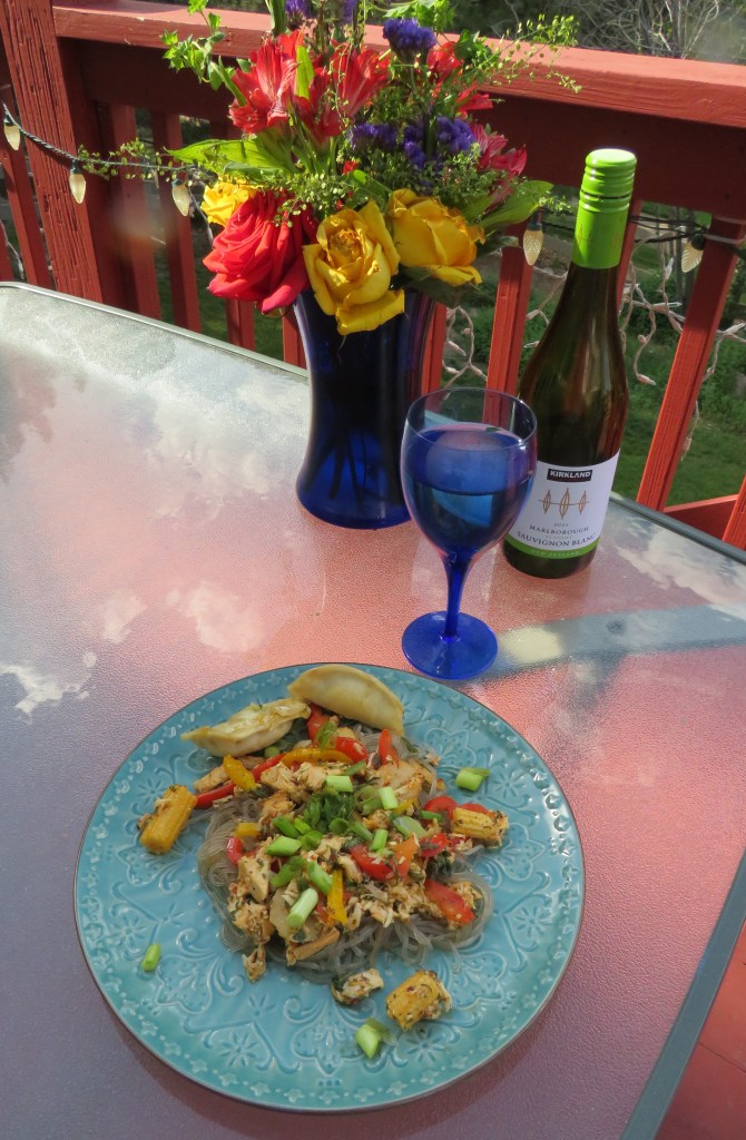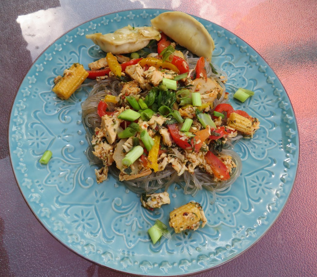 Whenever the mercury starts to rise, our dinners become lighter and lighter. That means more and more salads; salads of all kinds. My newest salad was a Thai chicken and noodle salad with vegetables. I was looking for soba noodles, but couldn’t find them, so I used glass noodles instead. It was a nice summer meal to enjoy out on our beloved deck.
