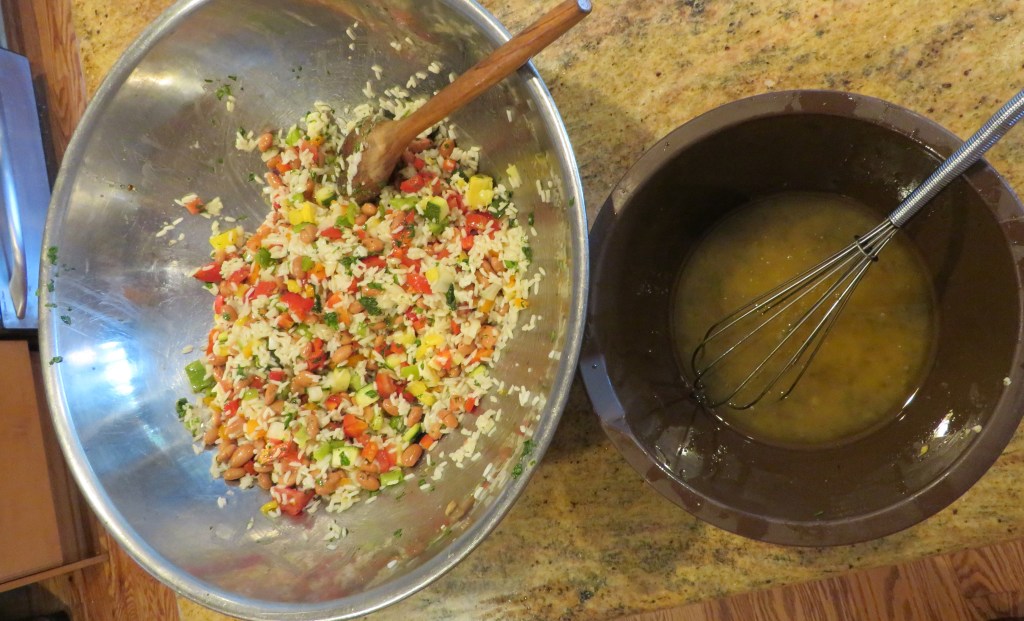 Mix the rice, beans and vegetables together. Add enough dressing to coat everything and give it all good flavor without drowning the salad in dressing. Chill in the refrigerator until ready to serve. Serve cold or at room temperature.