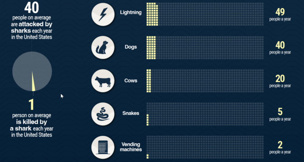 2. Which is more dangerous – sharks or vending machines? Poor sharks get such a bad rap. People think they are man-eaters, but they really are NOT. Vending machines are much more deadly than sharks. We are twice as likely to be killed by a vending machine than a shark. For the most part, sharks really DON’T like us and are more afraid of us than we are of them. The yearly risk (in the United States) of dying from a shark attack is roughly 1 in 250 million. In contrast, the yearly risk of dying from a vending machine accident is roughly 1 in 112 million. Coconuts kill more people than sharks do too. People were 15 times more likely to be killed by falling coconuts than by a shark. Horses, cows and crocodiles kill way more people than sharks on an annual basis as well. Horses kill about 20 people a year and cows kill about 22. Crocodiles gobble up 1,000 people a year.