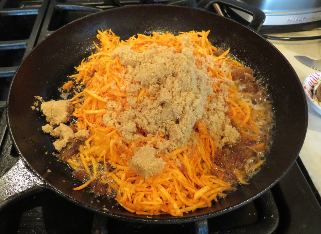 Peel and shred the sweet potatoes. Add to a hot skillet with the butter, brown sugar and salt & pepper.
