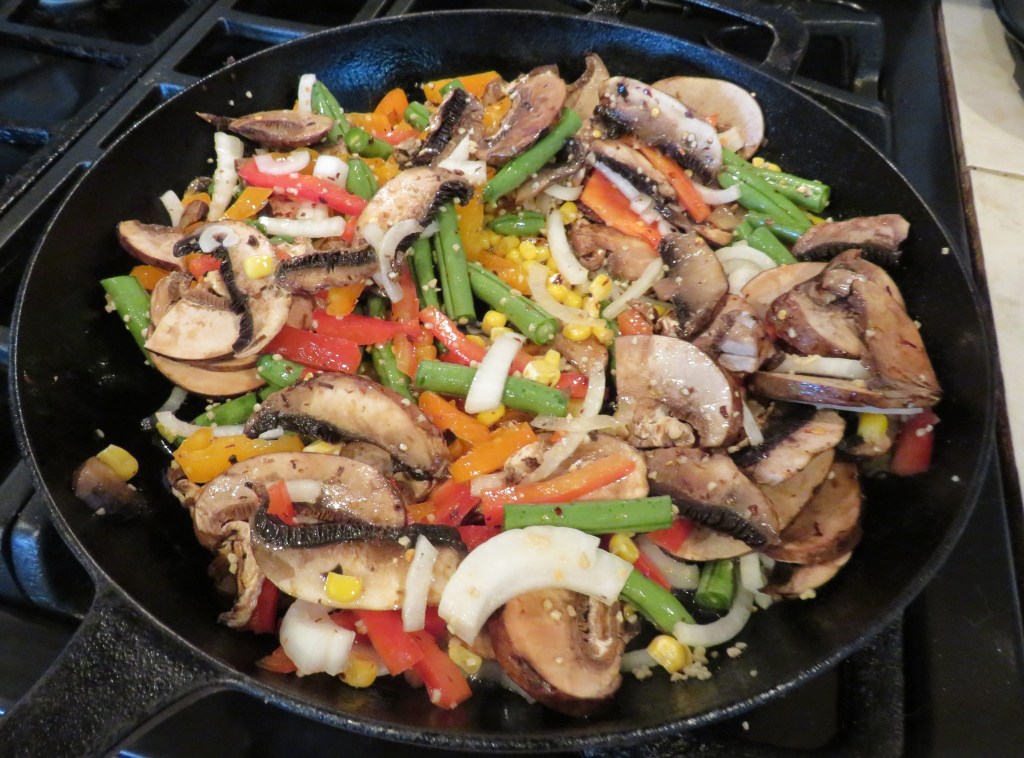 The hardier vegetables were cooked first in a hot skillet with olive oil. Cook them for about 3-5 minutes, stirring frequently, or until softened a bit.