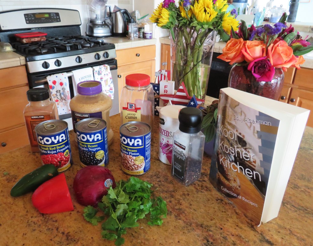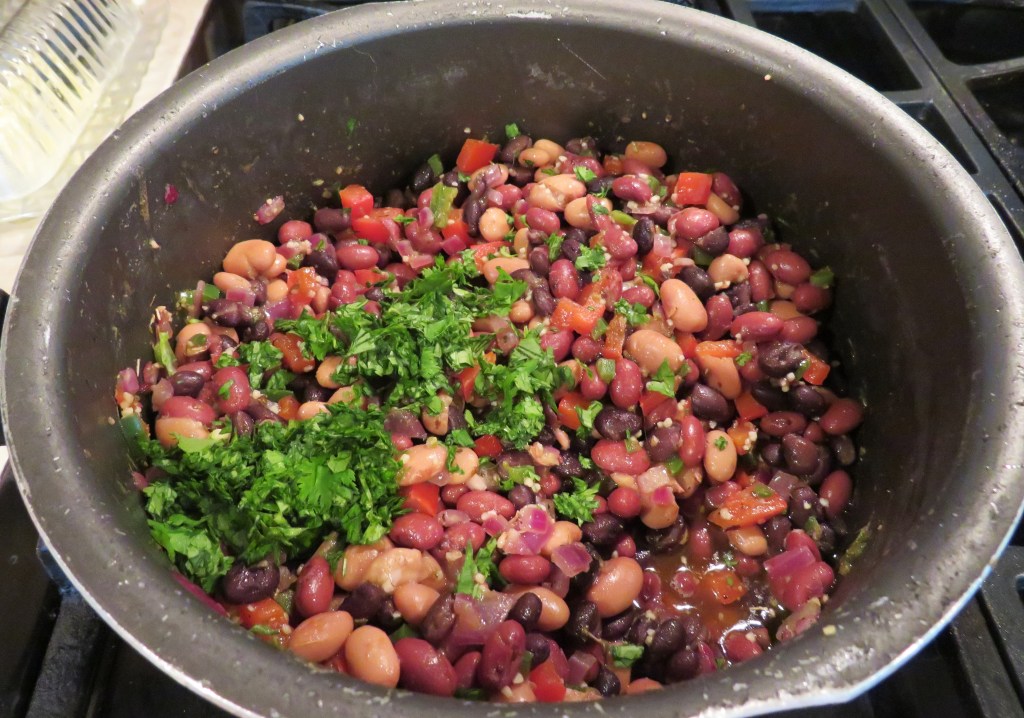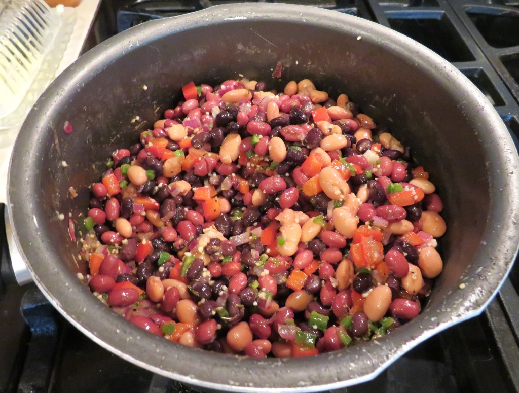Dolly’s beans used chickpeas or garbanzo beans and curry and were served room temperature. The only changes I made were that I substituted pinto beans for the garbanzo beans, omitted the curry and added some oregano and used red onions instead of white or yellow onion and added some red bell pepper. I also cooked them and served them hot. They were more like Cubano beans instead of Moroccan beans, but they were still delicious.