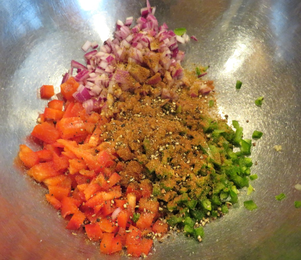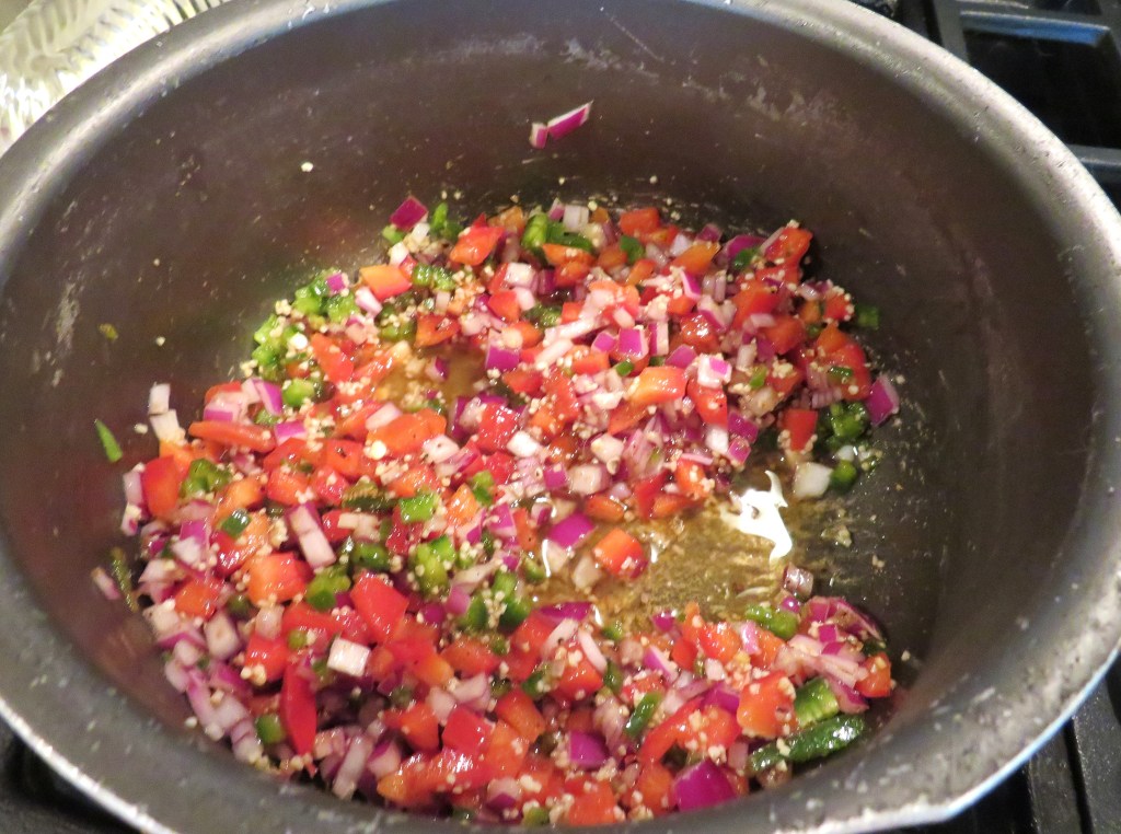 Get a medium sized pot hot and add the olive oil, red peppers, jalapeno, onions, garlic and seasonings. Saute for about 1-2 minutes, or until the onions are translucent.