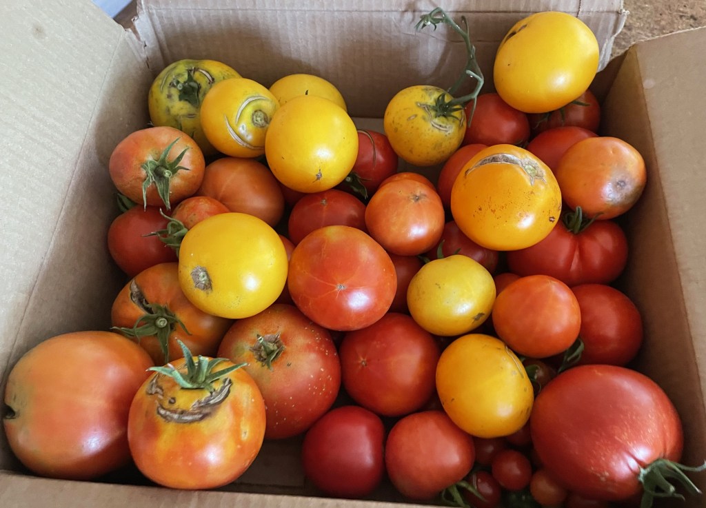 The tomatoes just keep on comin’. I had yet another banner batch. Again, I gave quite a few away, and still had a ton left over. This is my 4th batch, just since Janet and Bob have been gone on vacation, less than 2 weeks. I will pick one more round tomorrow, before Janet and Bob get home from their trip, leaving most of what I pick for them to enjoy. They knew they would not be able to enjoy all the tomatoes while they were gone, and asked me to pick them and do what I could with them while they were gone. And that I did too. I have most definitely enjoyed their tomatoes this bountiful season. 🙂