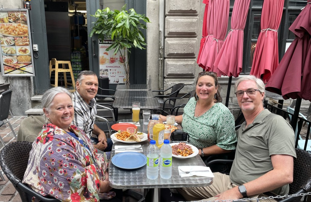 After our fantastic tour of Old Montreal, and walking all over the beautiful city, it was time to stop and enjoy some of the famous foods of Montreal. We stopped and ate at one of the many outside cafes. Between the four of us, we did our best to enjoy the four most famous foods of Montreal – poutine, maple syrup, smoked meat and bagels (though we tried the bagels later on).