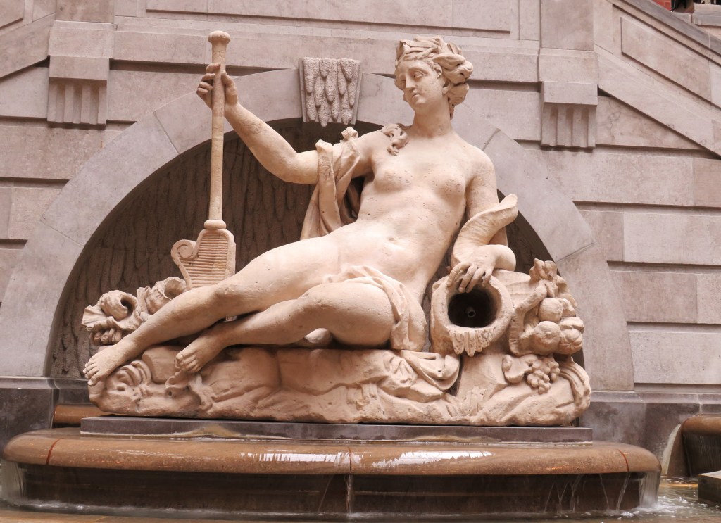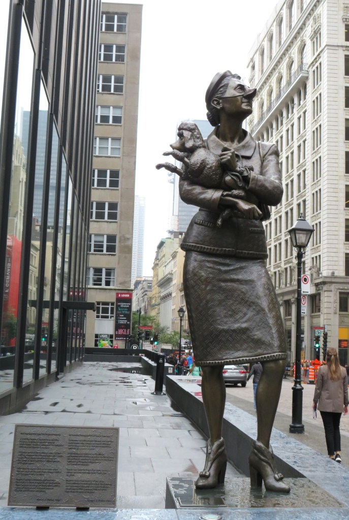 Facing the old bank is a statue of a French woman holding her poodle, turning up her nose at the English, and “their love of money”.