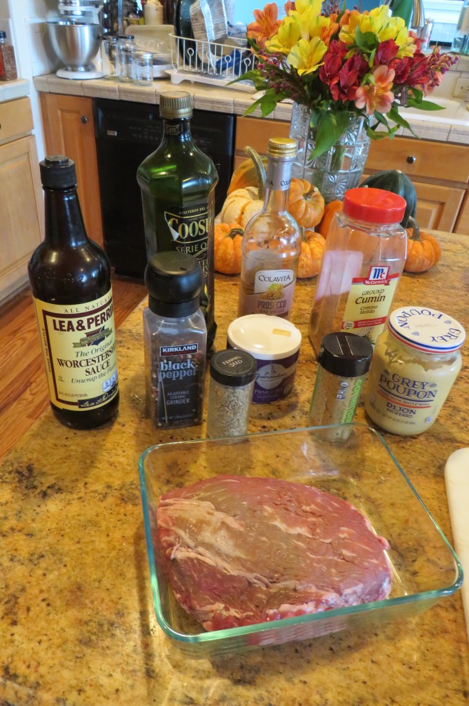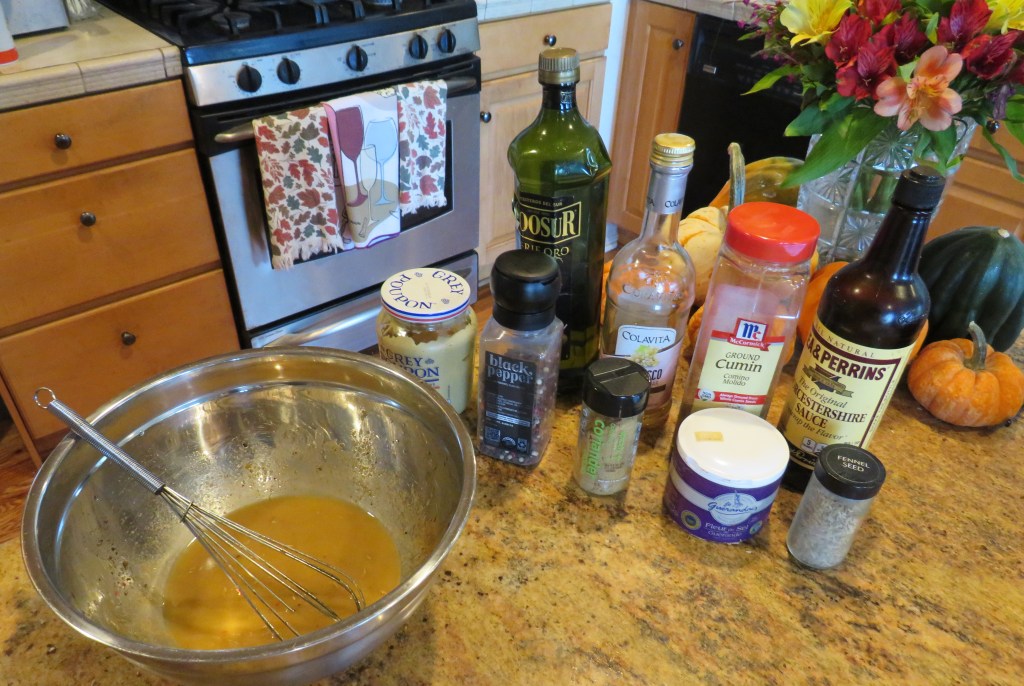 Toast the spices in a small skillet for about 2-3 minutes, or until they become fragrant, then mix in with the oil, vinegar, Worcestershire Sauce and mustard and whisk everything together and let it set until ready to use.