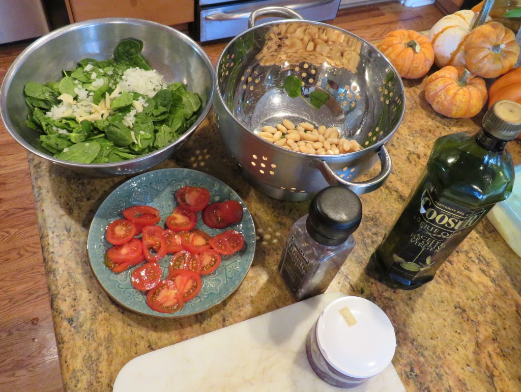 My steak still needed something else, so I sauteed spinach with onions and garlic, salt, pepper and olive oil. Once the spinach was cooked, I tossed in a can of drained and rinsed cannellini beans. I used this as my base and built it all up from there.