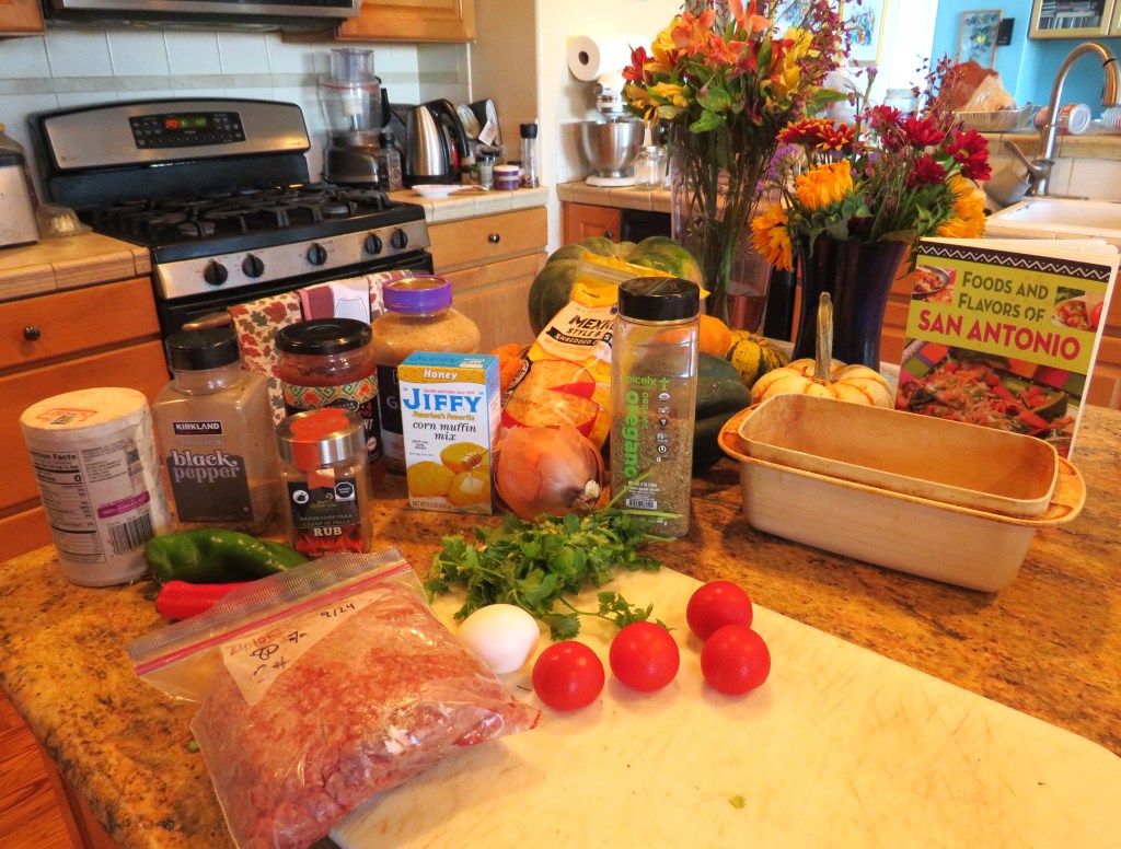 If you like tamales but you don’t have the time to make them, a good alternative is either a tamale pie or a tamale meatloaf. I am getting into my Texas and Tex-Mex frame of mind since we are heading out to Texas for Thanksgiving with some of my cousins. Ground beef was in our weekly meat rotation, so I made a tamale meatloaf. It had all the goodness of a tamale without the hassle. It was all baked underneath the cornbread topping. 🙂