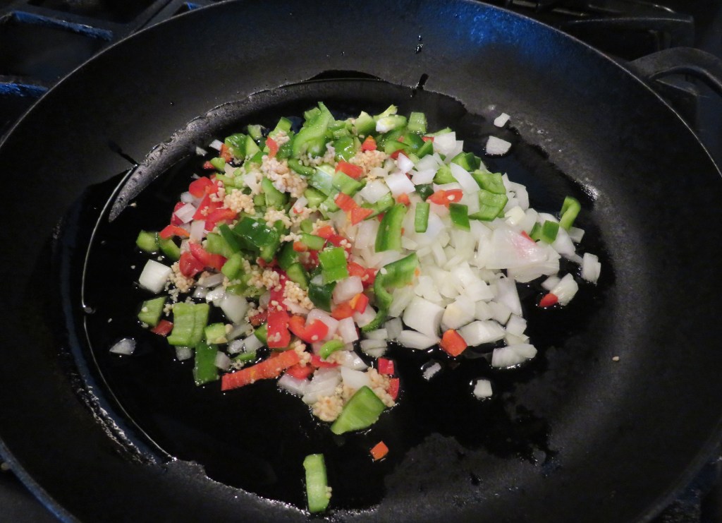 Saute the onions, peppers and garlic for about 3 minutes or until softened and the onions are translucent.