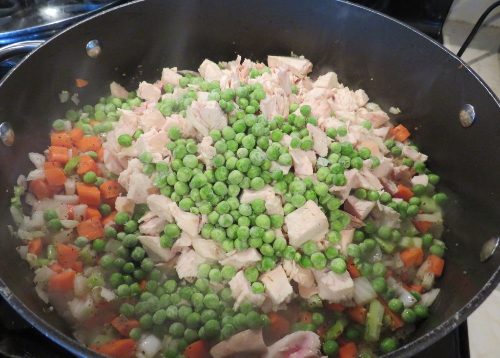 Then I added my cubed chicken, peas, seasonings, and chicken stock.
