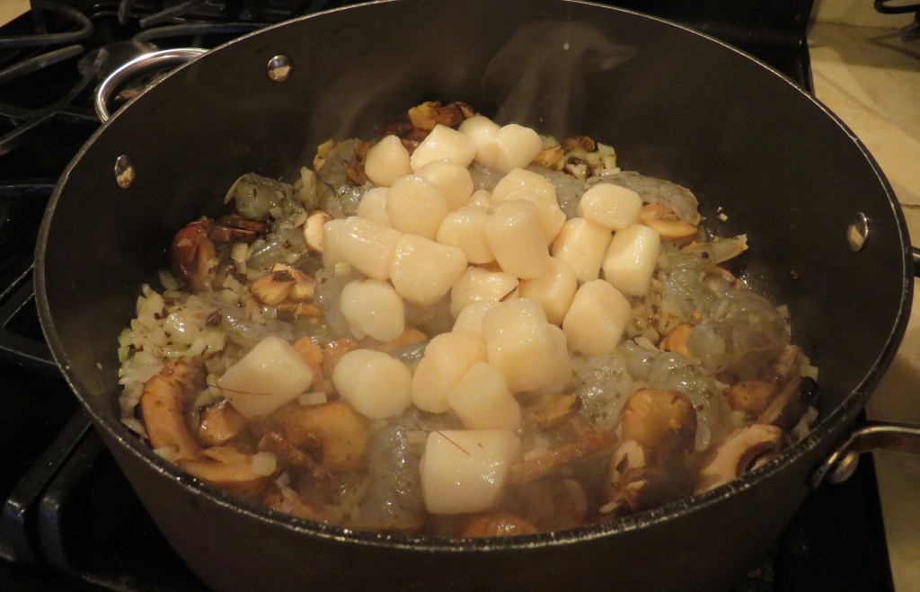 Add the vodka or Ouzo and bring to a boil, then add the scallops, shrimp and tomatoes.