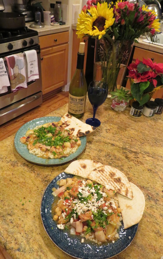 Serve it over a bed of cooked couscous and immediately top with feta cheese. You can also top it with the feta cheese before serving it up and broil the mixture for about 5 minutes, or until the feta is all melted and baked into the casserole. I didn’t do that because I didn’t want any cheese on mine, but Larry did. I served it with fresh chopped basil and parsley on top and warmed pita bread and a chilled white wine on the side to complete the meal.